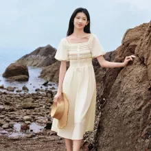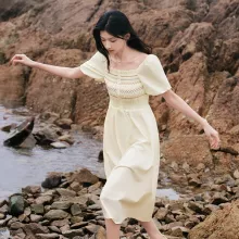 Step into spring with this stunning mid-length dress that combines playful charm with graceful elegance. The square neckline and bubble sleeves make this dress an absolute standout, offering both a touch of vintage sophistication and a modern, carefree vibe. Perfect for any casual outing, this dress is designed to keep you comfortable and stylish during those warmer months.
